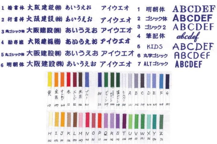 弊社にてネームをお入れ致します。大きさ・漢字書体・英語書体・糸の色をご相談ください。指定文字・指定マークのあるお客様はデータをメールにて投稿してください。