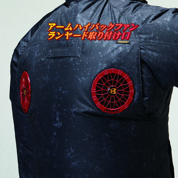 | 仕様1 | 背面に干渉しない凡用性の高さが魅力のサイドバックファン取付モデル 軽量、撥水性、アルミコーティング加工による遮熱性(-8℃)を備えたソフトシェル素材 |