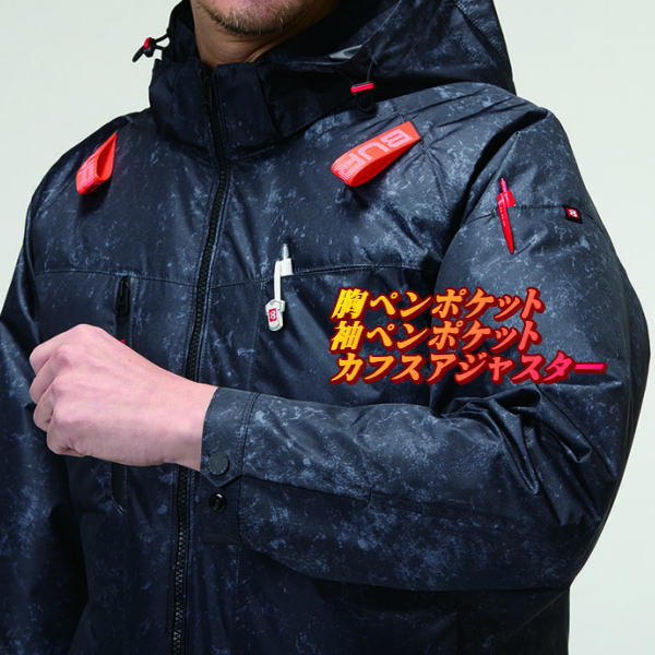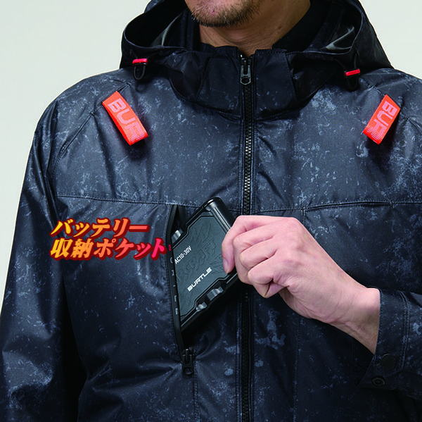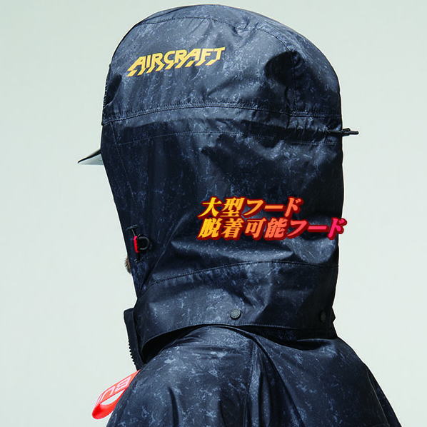 | 仕様2 | 背ヨークに保冷剤を収納可能な通気エアダクトポケットを装備 ヘルメット収納フード(着脱可能)フックハンガー、背ランヤードホールを配備しフルハーネスに完全対応 |