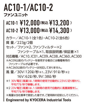 対応機種などAC10,IC01,AC09,AC08,AC360,AC300 ご注意AC260以前のバッテリーは対応していません。風量30V:120ℓ/秒 23V:91ℓ/秒 16V:62ℓ/秒 9V:38ℓ/秒 30Vでの稼働は1時間ですその後23Vに自動的に変わります